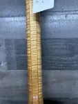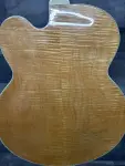 Very beautiful and highly flamed Gibson Super 400. Missing its bridge, switch and part of the tailpiece. Three tuner ferrules and the pickguard are not installed but included. No evidence of damage or repairs. Some corrosion to the pickup covers and metal parts. Will need and is worthy of restoration. The nut is off-center.8.6lbs. Original hard case included.