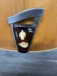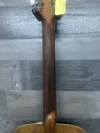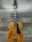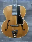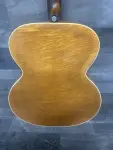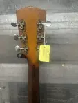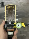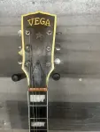 Early 50's Vega archtop electric guitar with changed pickup and a modern 1/4" plug covering. Chinese made mini Humbucker is mounted on what appears to be the original pickguard. The original volume and tone controls are in working order. Shows playwear but no abuse. Nice flame to the back and sides. The star inlay is missing from the headstock and some fretboard inlays are worn down. Dents and dings to the finish. There is rutting in the fingerboard at the first position and it may have been partially refretted. Minor white and red scuffs to the bottom edge. No visible serial number. 5.8lbs. Comes with gigbag!
